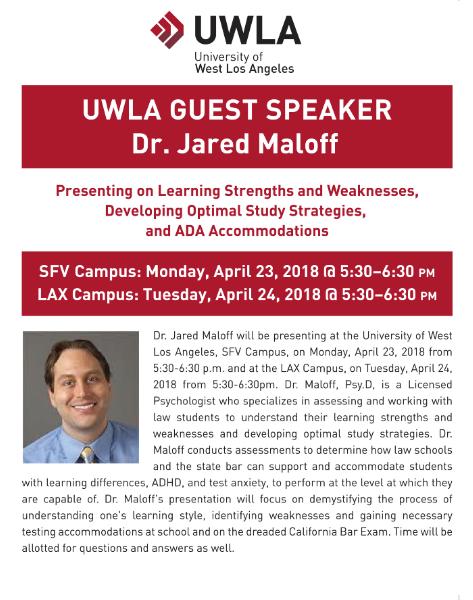 Dr. Jared Maloff will be presenting at the University of West Los Angeles, SFV Campus, on Monday, April 23, 2018 from 5:30-6:30 p.m. and at the LAX Campus on Tuesday, April 24, 2018 from 5:30-6:30 p.m. Dr. Maloff, Psy.D, is a Licensed Psychologist who specializes in assessing and working with law students to understand their learning strengths and weakness and developing optimal study strategies.