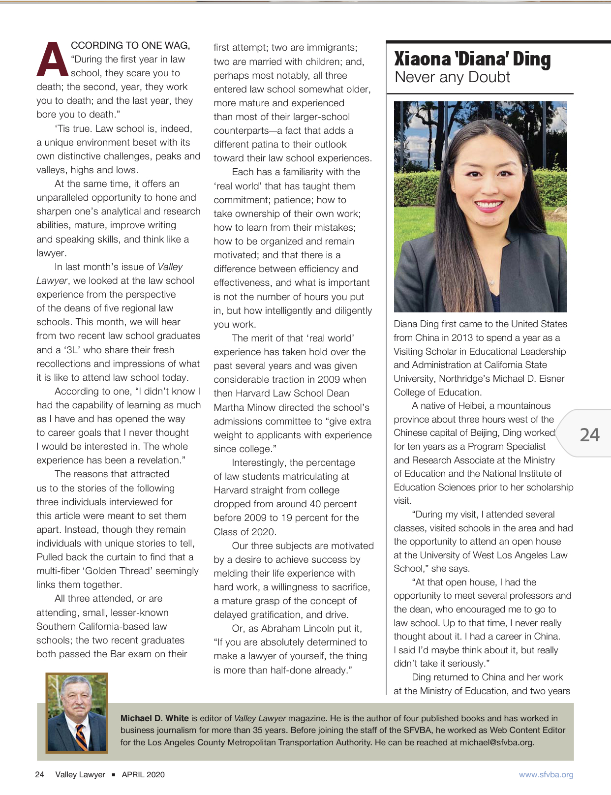 UWLA Alumna Diana Ding was interviewed by the Valley Lawyer, the monthly publication of the San Fernando Valley Bar Association, and the April 2020 issue ran a feature article about her law school experience at UWLA from the perspective of an international student .