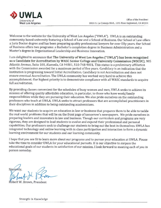 I am delighted to announce that The University of West Los Angeles (“UWLA”) has been recognized as a Candidate for Accreditation by WASC Senior College and University Commission (WSCUC), 985 Atlantic Avenue, Suite 100, Alameda, CA 94501, 510-748-9001. This status is a preliminary affiliation with the Commission awarded for a maximum period of five years. Candidacy is an indication that the institution is progressing toward Initial Accreditation. Candidacy is not Accreditation and does not ensure eventual Accreditation. The UWLA community has worked very hard to achieve this accomplishment. Our highest priority is to demonstrate compliance with all WASC standards to acquire full accreditation.