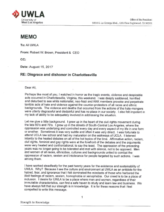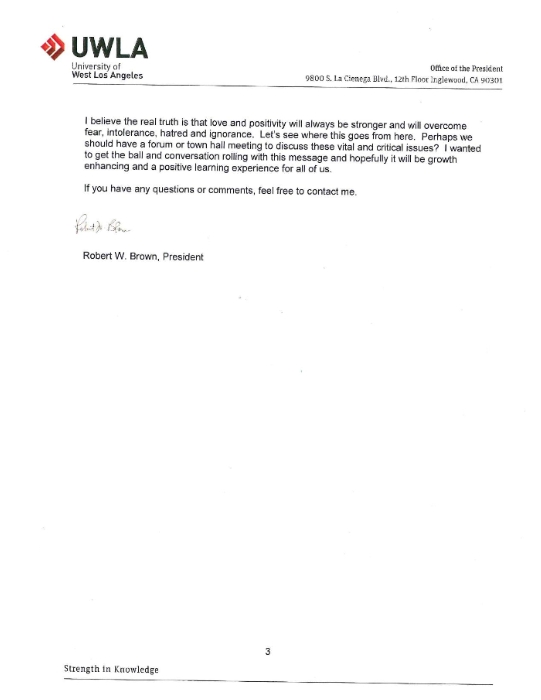 I have worked steadfastly for the past twenty years for the existence and sustainability of UWLA. Why? Because I see the culture and environment at UWLA as an antidote for the hatred, fear and ignorance that I felt dominated the mindsets of those who harbored the illicit feelings of racism, sexism, homophobia or xenophobia. Our creed is to be a place of inclusion. I desire for UWLA to be a place where men and women, regardless of their immutable characteristics, can find a safe haven to study and learn law and business. We have always felt that our strength is in knowledge. It is for these reasons that I feel compelled to write this message.