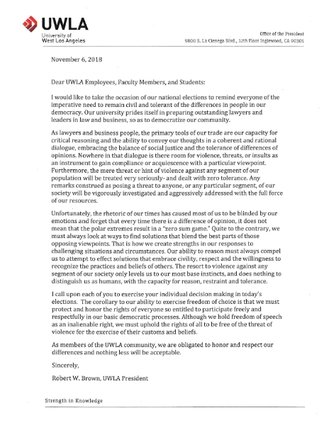 I would like to take the occasion of our national elections to remind everyone of the imperative need to remain civil and tolerant of the differences in people in our democracy. Our university prides itself in preparing outstanding lawyers and leaders in law and business, so as to democratize our community.As lawyers and business people, the primary tools of our trade are our capacity for critical reasoning and the ability to convey our thoughts in a coherent and rational dialogue, embracing the balance of social justice and the tolerance of differences of opinions. Nowhere in that dialogue is there room for violence, threats, or insults as an instrument to gain compliance or acquiescence with a particular viewpoint. Furthermore, the mere threat or hint of violence against any segment of our population will be treated very seriously- and dealt with zero tolerance. Any remarks construed as posing a threat to anyone, or any particular segment, of our society will be vigorously investigated and aggressively addressed with the full force of our resources.