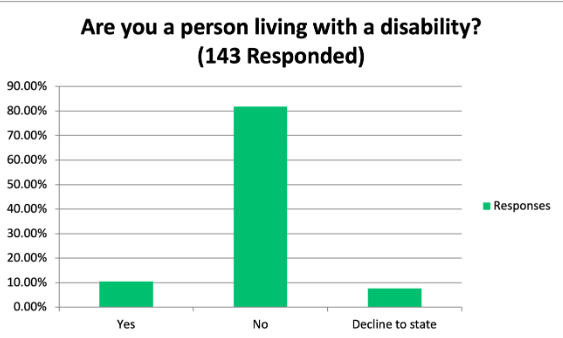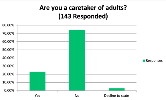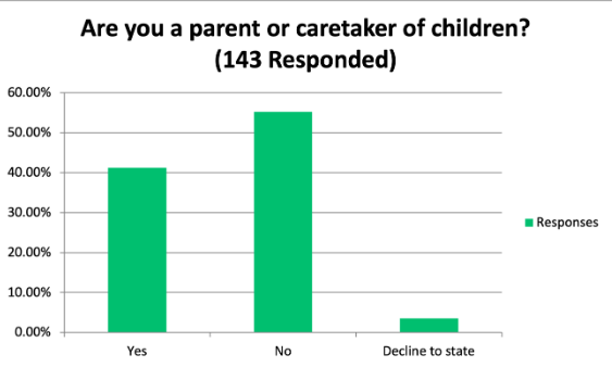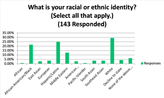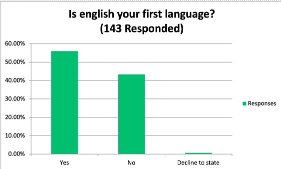 When asked, What languages(s) do you speak at home? Of the 143 that responded, 55% indicated that they speak a language other than English at home. In fact, 22 languages were identified: Arabic, Aramaic, Armenian, ASL, Banga, Ebonics, Farsi, French, German, Gujarati, Hebrew, Hindi, K’iche, Marathi, Patois, Portuguese, Punjabi, Russian, Spanish, Tagalog, Urdu, and Vietnamese