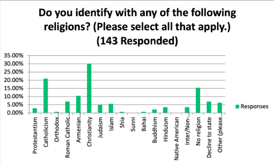 Additional responses received were: Christian orthodox, I was born into the Catholic religion, but I have been learning and respecting several other religions., I'm Moslem by tradition but I don't practice any religion, Jehovah’s Witness, Luciferianism, Seven day Adventist, Sikh, Sikhism, and Zoroastrian.